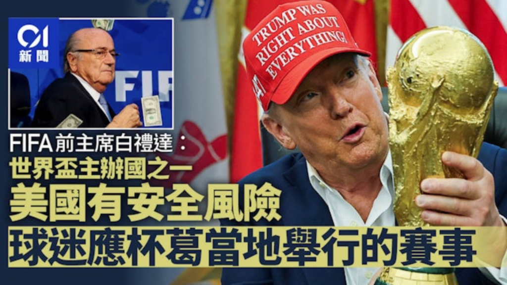 FIFA前主席白禮達:美國有安全風險 球迷應避免前往世界盃 教学 January 27, 2026 / 0 Comments 四年一度嘅足球壇盛事——世界盃即將舉行。國際足協(FIFA)前主席白禮達(Sepp Blatter)近日表示,對其中一個主辦國美國嘅安全問題感到憂慮,並呼籲球迷杯葛喺當地舉行嘅賽事。